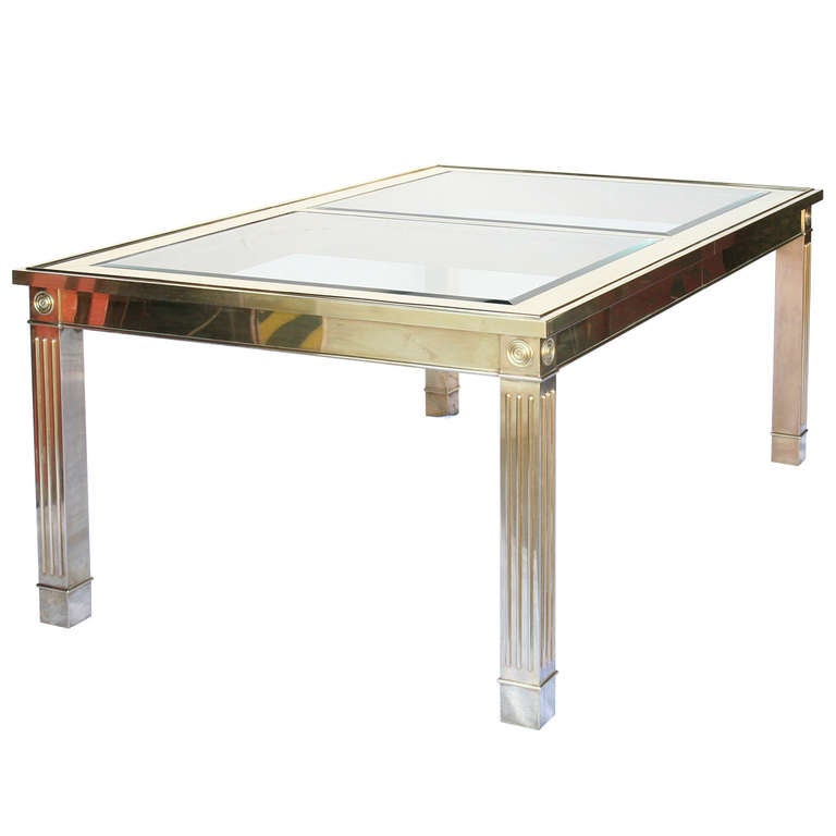 Brass and glass pedestal dining table by MASTERCRAFT at ... from shard4.1stdibs.us.comShop glass dining room tables and other glass tables from the world's best dealers at 1stdibs. The 3/4 beveled glass top is supported by two triangular bases with brass appointments. Glass dining table and chairs.